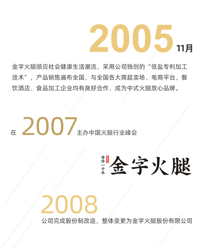 >金字火腿順應(yīng)社會健康生活潮流,采用公司獨(dú)創(chuàng)的“低鹽專利加工技術(shù)”,產(chǎn)品銷售遍布全國,與全國各大商超賣場、電商平臺、餐飲酒店、食品加工企業(yè)均有良好合作,成為中式火腿放心品牌。